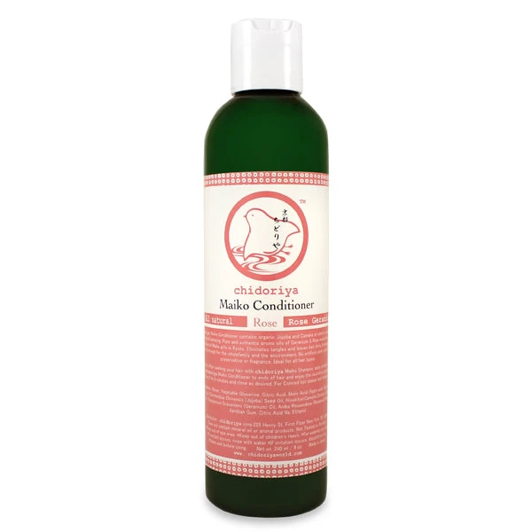 Use Rose Maiko Conditioner to hydrate and soften your hair, amplifying shine, and improving manageability. Formulated with certified organic Jojoba and pure Camellia oil to leave your hair nourished and healthy. Scented with a beautiful essential oil blend of geranium and rosewood, a traditional favorite of Maiko girls in Kyoto.Ideal for all hair types and suitable for sensitive scalps. No artificial color, synthetic preservative or fragrance.