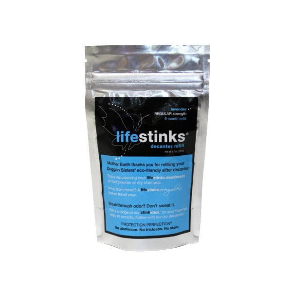 Is it time to refill your eco-friendly sifter container? Make sure you have your original Duggan Sisters lifestinks decanter; it is 100% stainless steel with an ultra-fine mesh for smooth application. It is guaranteed to provide you with quality results by protecting your botanical-rich deodorant from light, cross-contamination and aluminum-laced containers.This Lavender Regular Strength Refill Bag contains a 9-month supply of lifestinks. Yep, that’s right, $2 per month for the world’s smartest and most effective deodorant. Be good to Mother Earth and your budget.Aluminum-free. Triclosan-free. Fragrance-free. Talc-free. Stain-free.