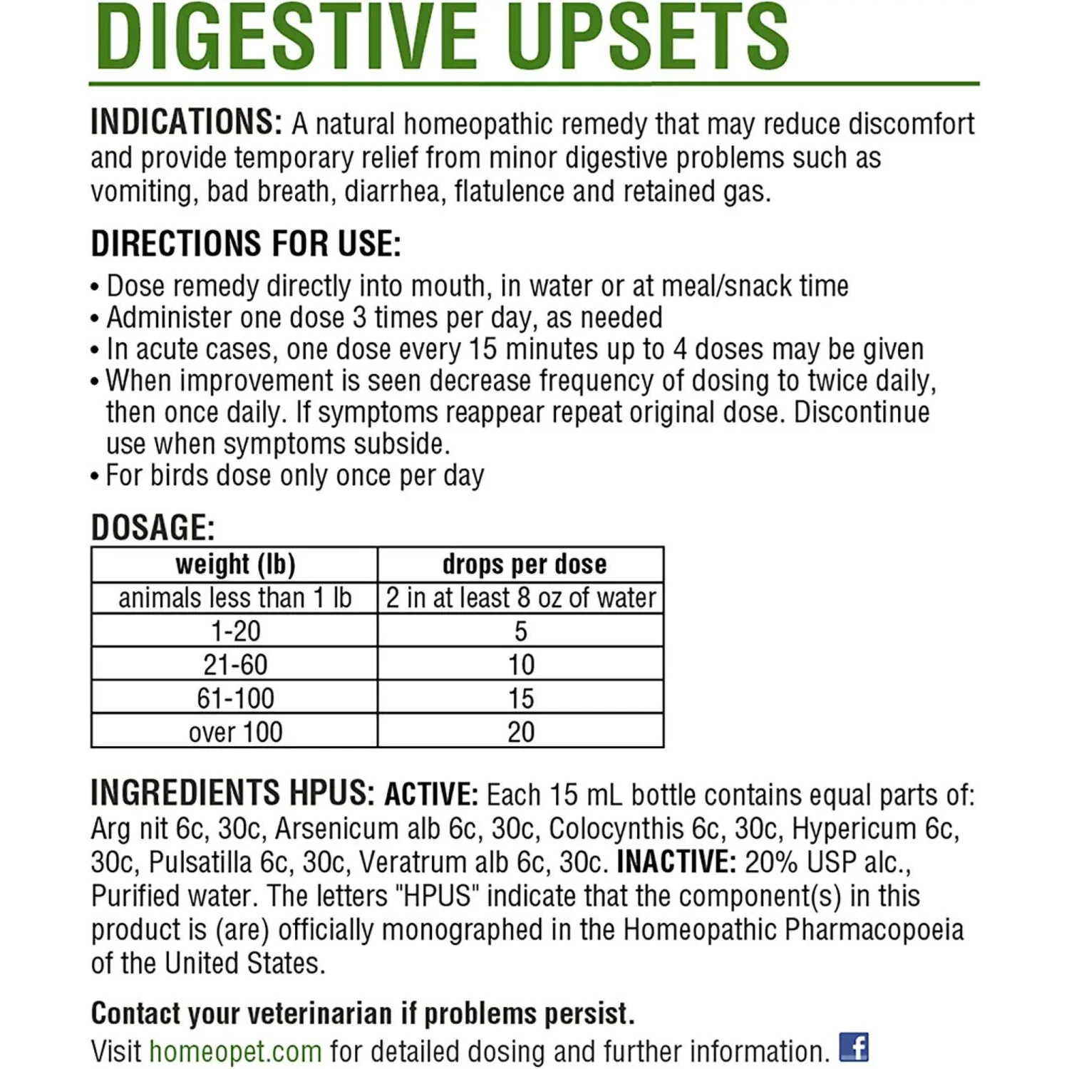 For vomiting, food regurgitation, diarrhea, colic, flatulence, bloat due to retained gas, poor appetite or loss of appetite.