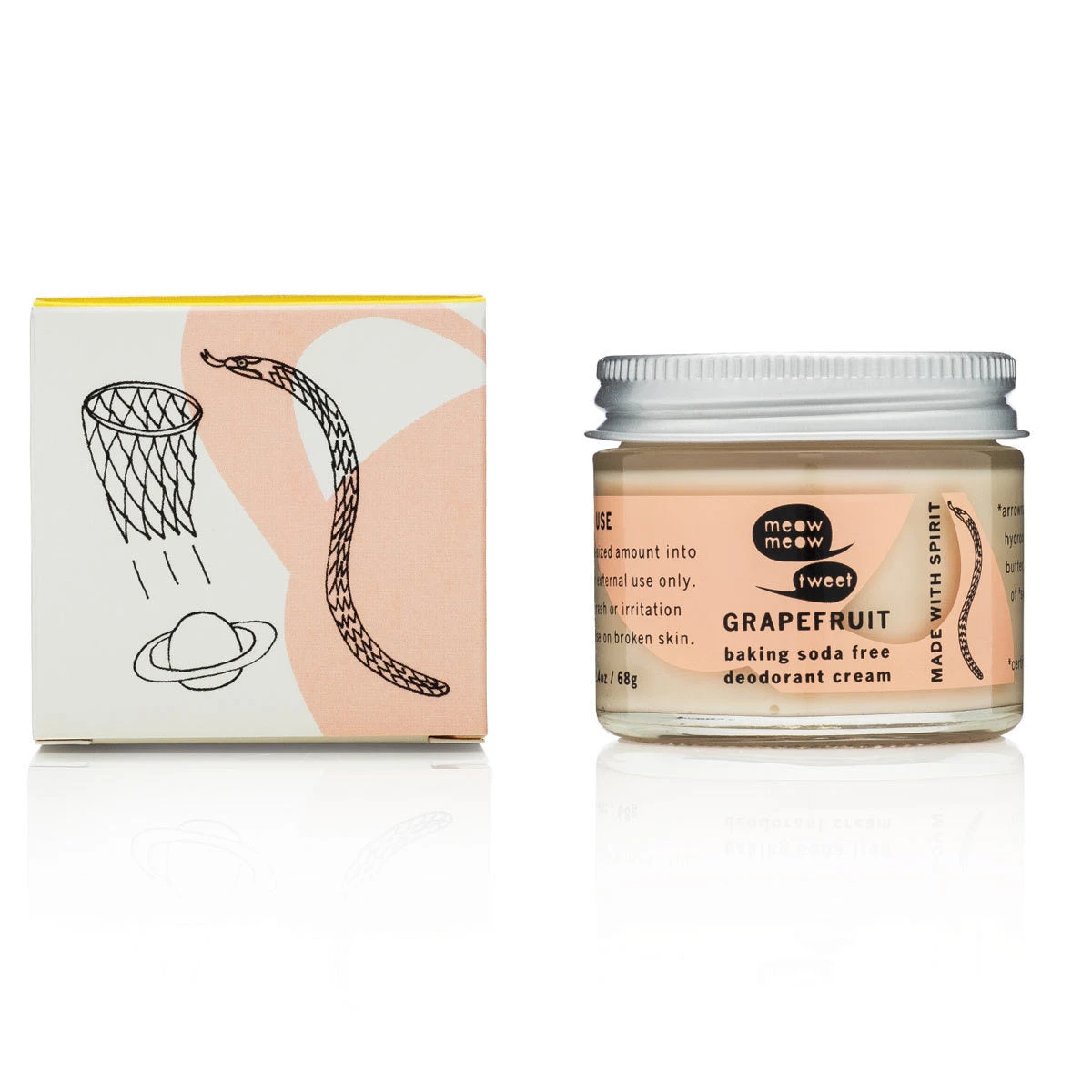 Made the switch to natural deodorant but struggle with underarm sensitivity from baking soda? Meow Meow Tweet took its well-loved classic deodorant cream and made a few modifications to create this new formula, perfect for those with sensitive skin and just as effective. Designed without baking soda and clay, this recipe uses dietary magnesium and arrowroot powder to help control moisture and odor. Nourishing plant oils and butters soothe and condition the skin, and a potent blend of citrusy essential oils keeps you smelling fresh throughout the day.Grapefruit citrus scent. 2.4 oz in a glass jar.