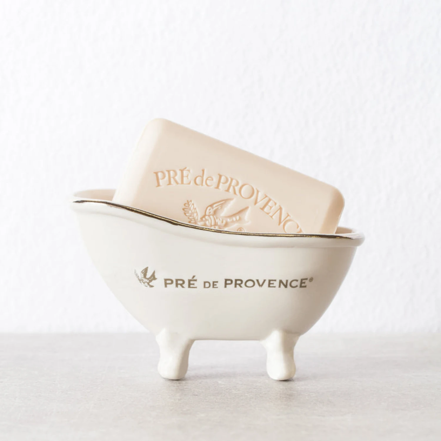 Pre de Provence Le Bain Soap Dish is a clawfoot bathtub inspired soap dish to enhance any kitchen or bath deco. Use traditionally (recommended with the Pre de Provence 250g smaller soap) or to hold trinkets and jewelry.Â